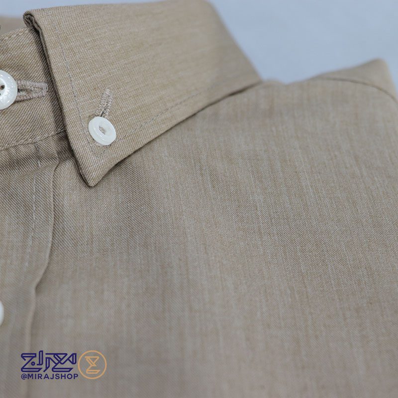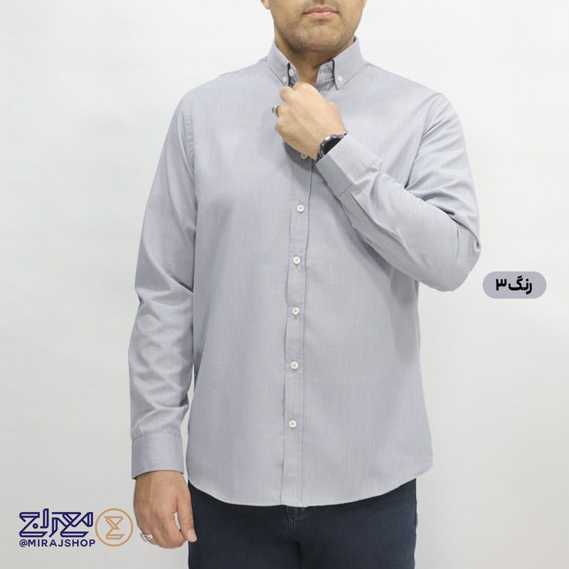 خرید آنلاین پیراهن تترون ملانژ مردانه از پوشاک معراج؛ با یقه دکمهدار و قاپک برای دکمهها، بافت نرم و لطیف و رنگبندی متنوع، مناسب محیطهای رسمی و روزمره.